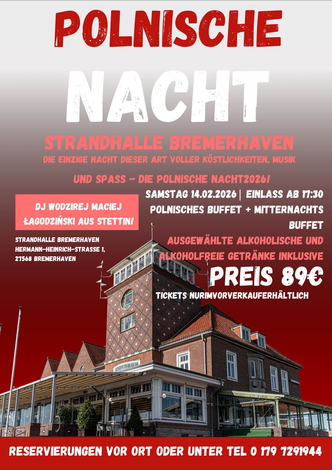 🇵🇱✨ POLNISCHE NACHT in der Strandhalle Bremerhaven ✨🇵🇱 Erlebe eine Nacht, die du nicht vergisst! ❤️ Am Samstag, den 14.02.2026, verwandelt sich die Strandhalle Bremerhaven in einen Ort voller polnischer Lebensfreude, Musik und kulinarischer Highlights. 🎶 DJ Wodzirej Maciej Łagodziński aus Stettin bringt mit original polnischen Beats die Tanzfläche zum Beben – Emotionen, Energie und pure Feierlaune garantiert! 💃🕺 🍽️ Polnisches Buffet & Mitternachtsbuffet Freue dich auf traditionelle polnische Köstlichkeiten, liebevoll zubereitet – ein Genuss für alle Sinne! 😋 🍷 Getränke inklusive Ausgewählte alkoholische und alkoholfreie Getränke sind im Preis enthalten – feiern ohne Sorgen! 🥂 🕯️ Einlass ab 17:30 Uhr – der perfekte Start in eine lange, unvergessliche Nacht 💰 Preis: 89 € (Tickets nur im Vorverkauf erhältlich!) 🎉 Diese Nacht ist mehr als ein Event – sie ist Leidenschaft, Gemeinschaft und polnische Tradition in ihrer schönsten Form. 📍 Strandhalle Bremerhaven 📞 Reservierungen vor Ort oder telefonisch unter 0179 7291944 👉 Sichere dir jetzt deinen Platz und sei dabei, wenn Bremerhaven polnisch feiert! 🇵🇱🔥